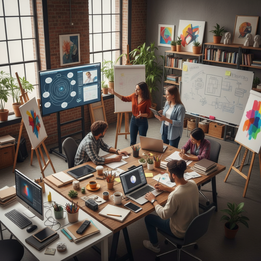 Creative team leveraging self starter helper to enable blended analog-digital innovation.