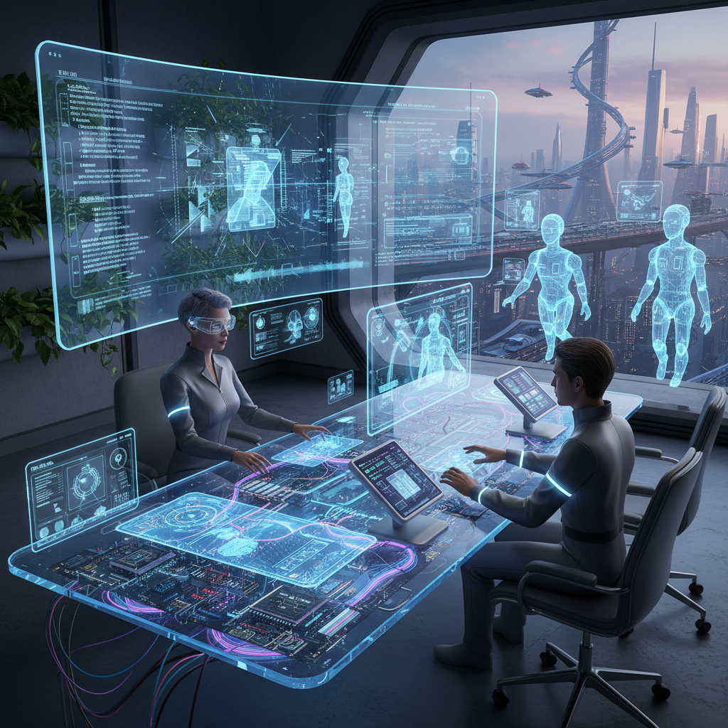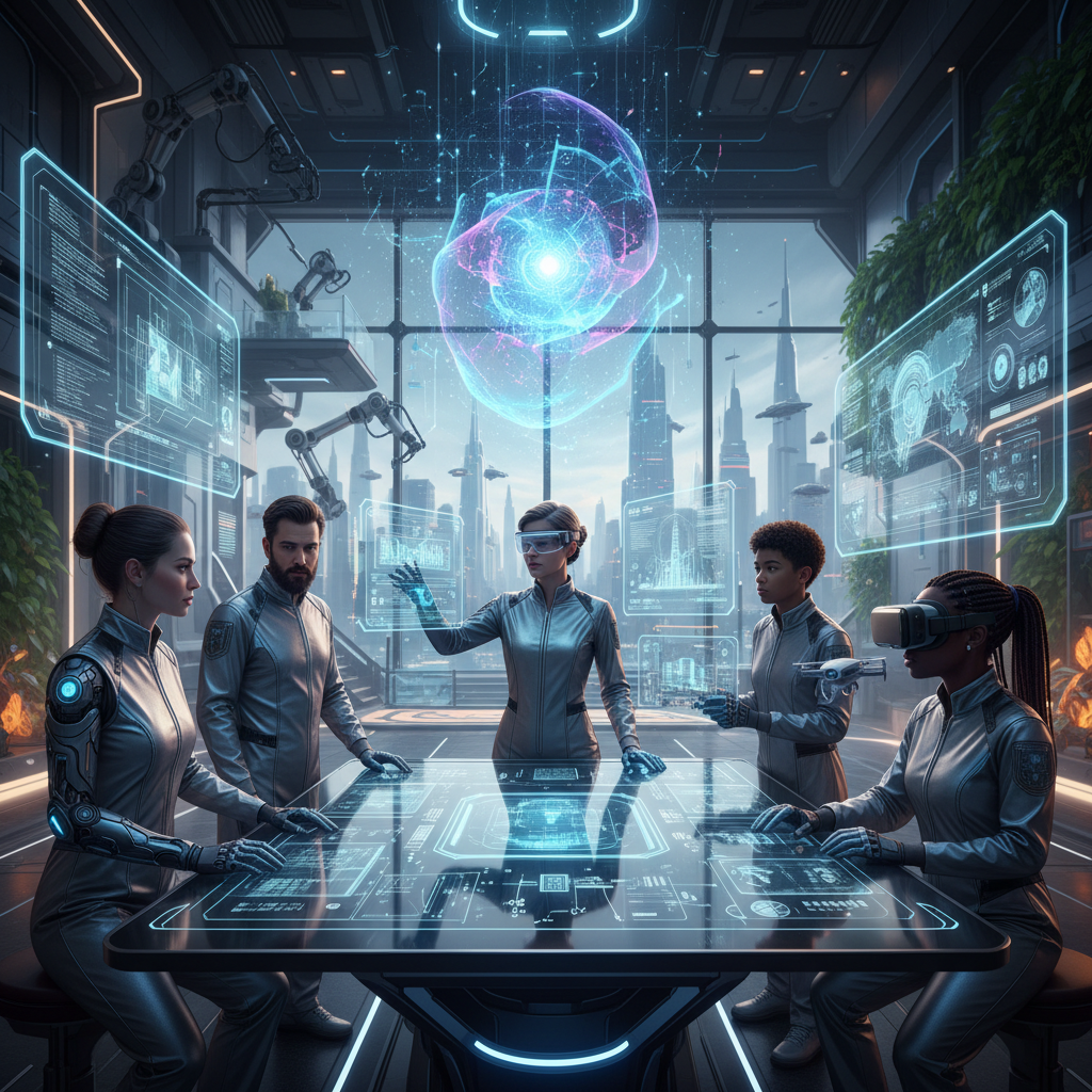 Futuristic team leveraging an AI-powered self starter helper for collaborative success.