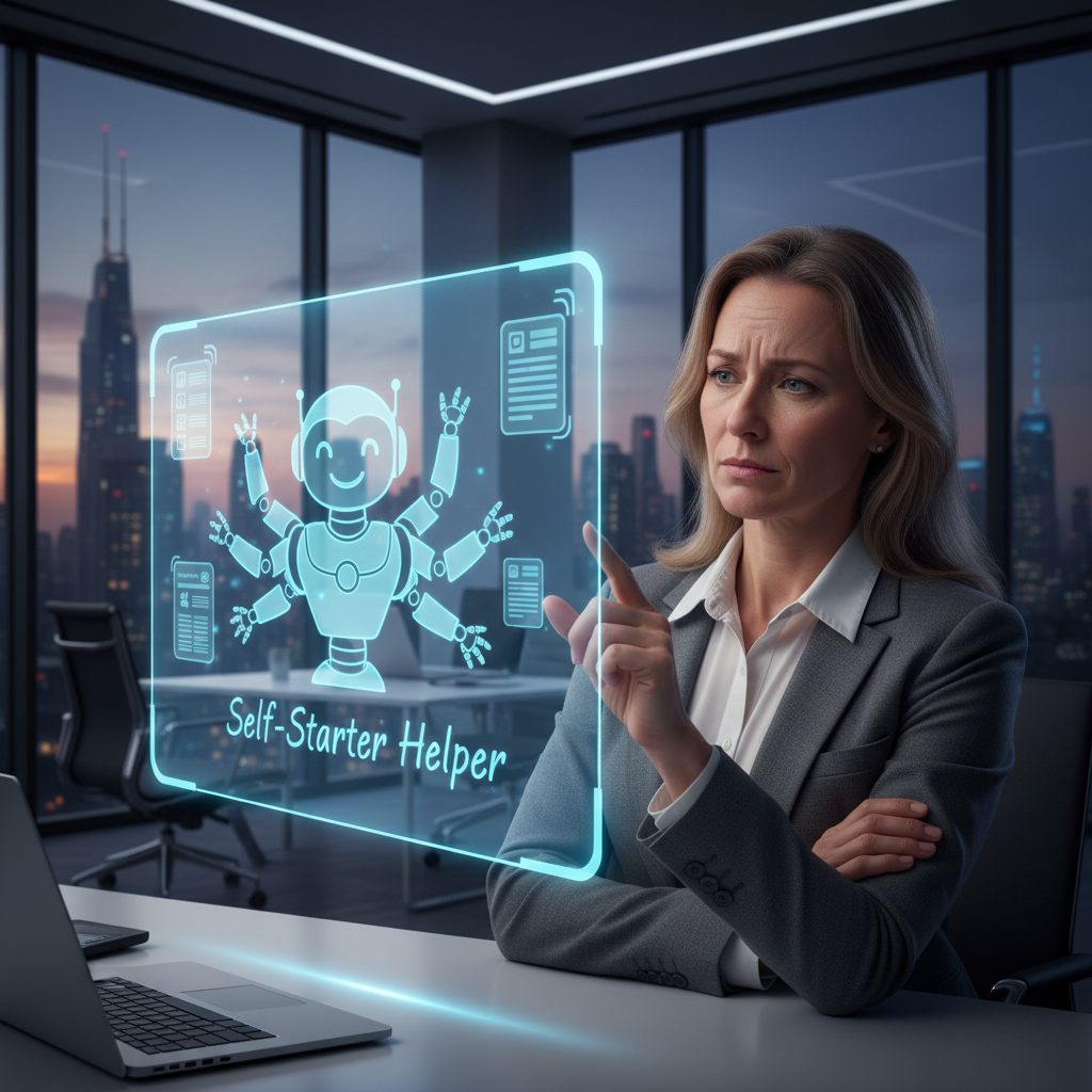 Skeptical professional evaluating actual value of AI-powered self starter helper.