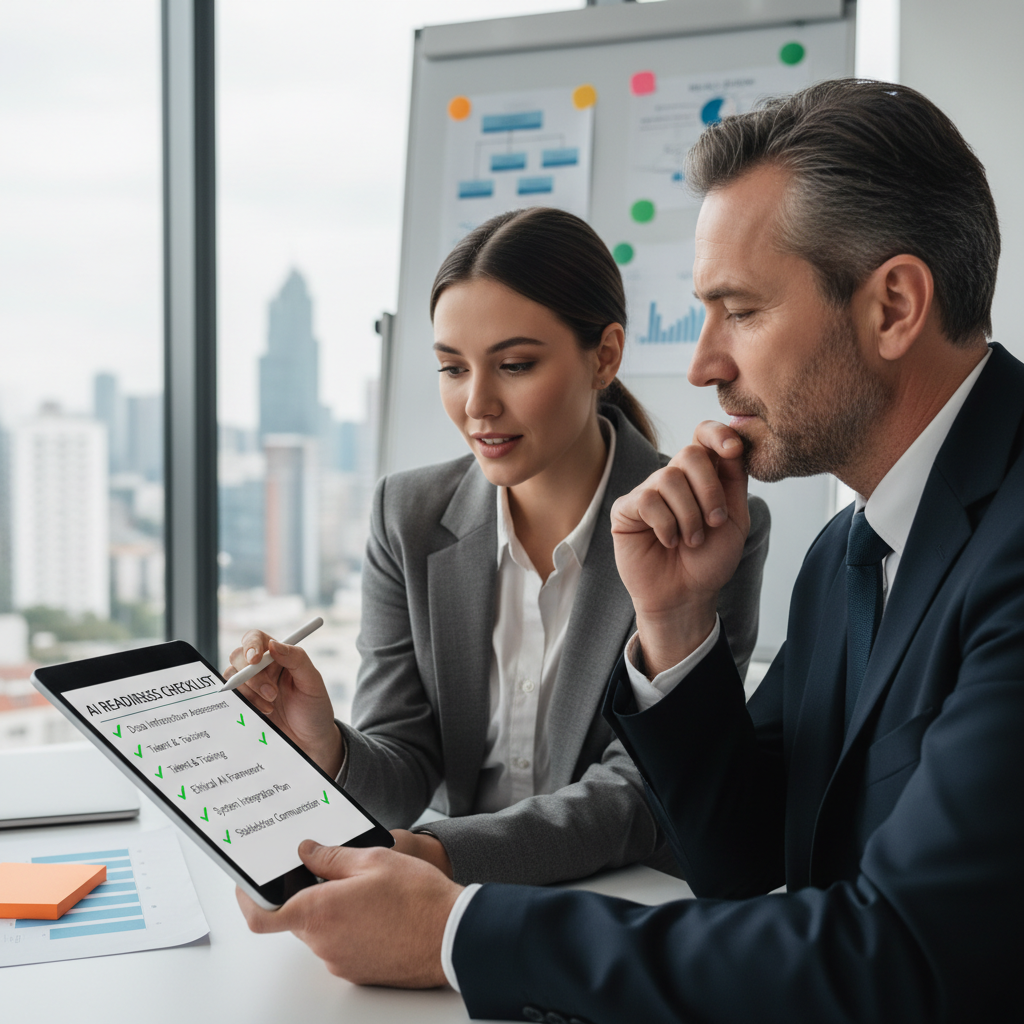 Photo: Business leader reviews checklist for AI integration readiness in a digital workspace