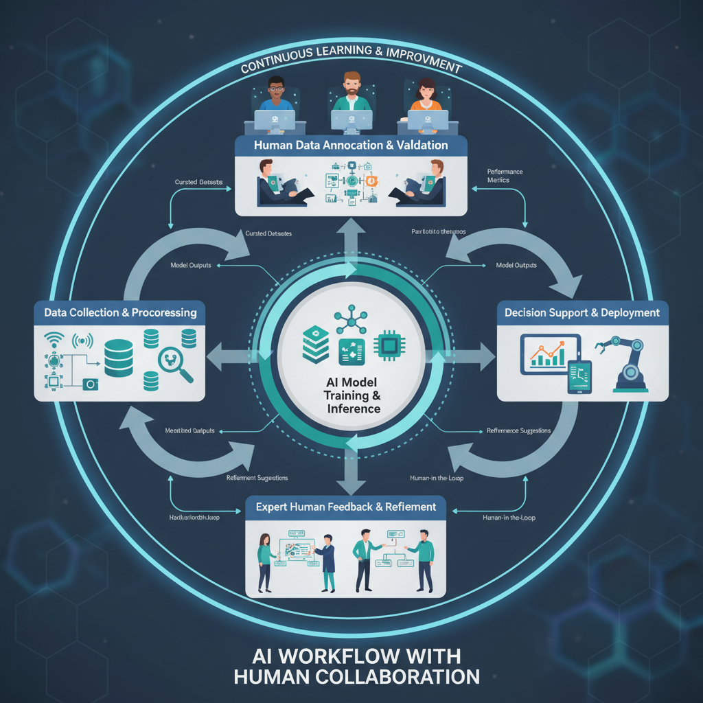 Collaborative intelligence: The premise that optimal outcomes come from blending human strengths (intuition, judgment) with AI’s speed and data processing.
