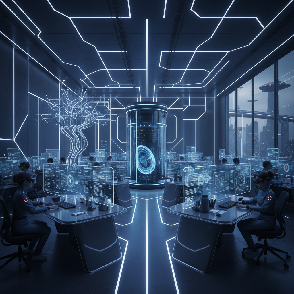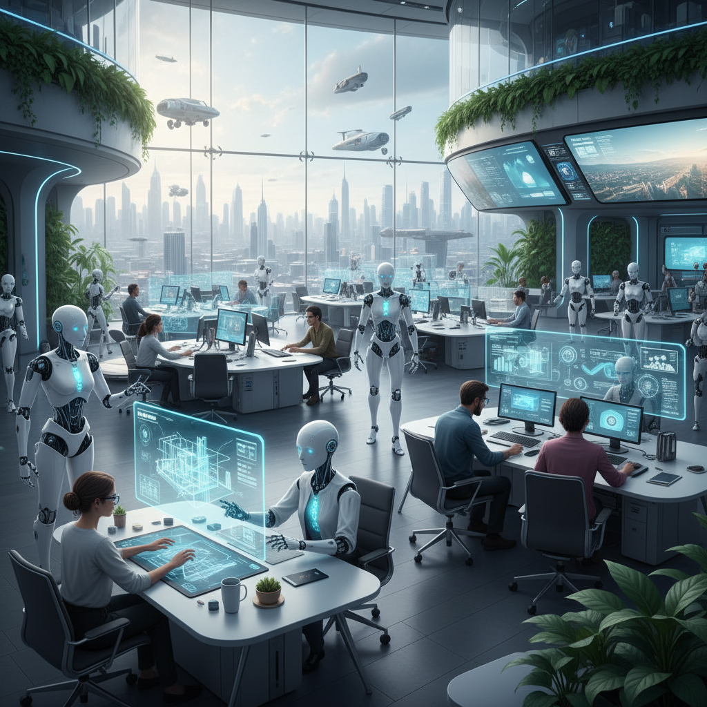 Alt: AI and human specialists collaborating in a dynamic office, future of specialize in office.
