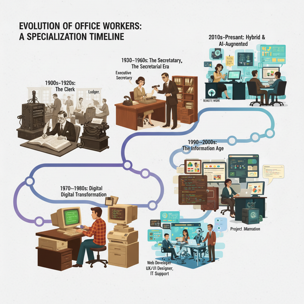 Alt: Evolution of generalist to specialist office roles, editorial photo for specialize in office.