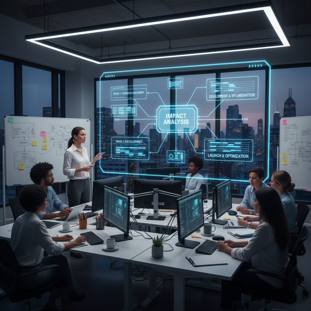 Futuristic office with AI interface screens. Alt: 'AI-powered project team collaboration.'