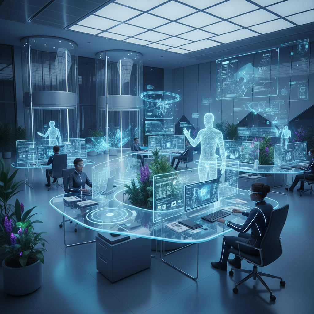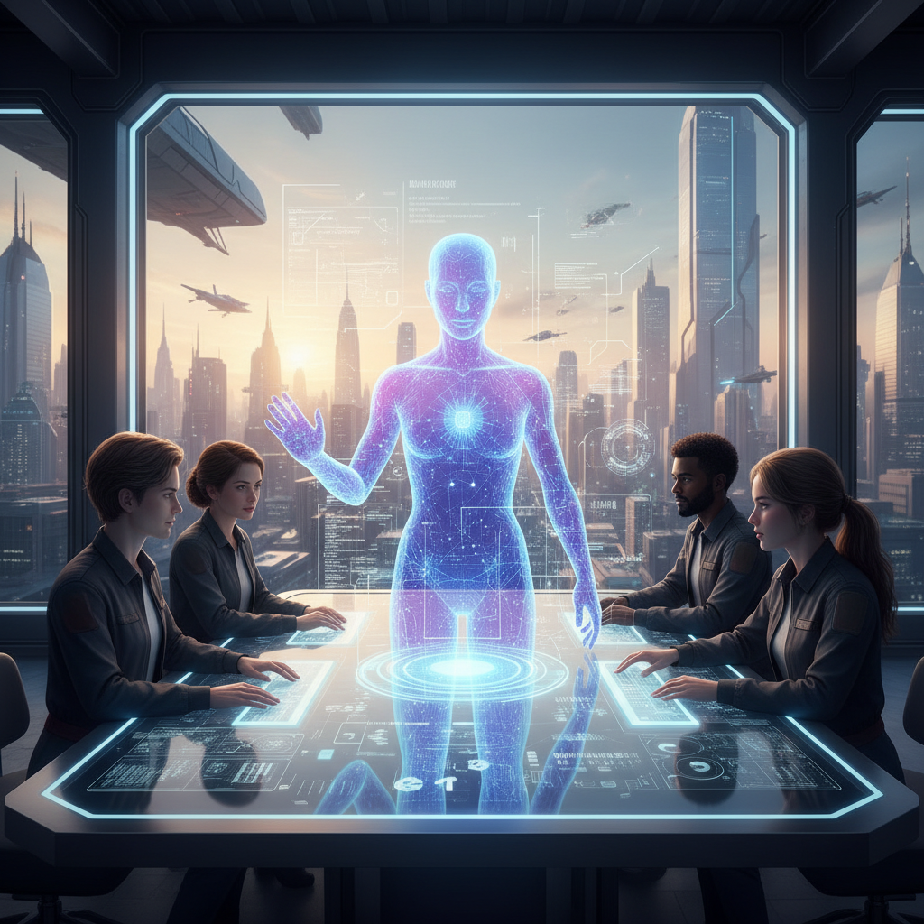 Alt: Human team with projected AI avatar, showcasing hybrid digital collaboration.