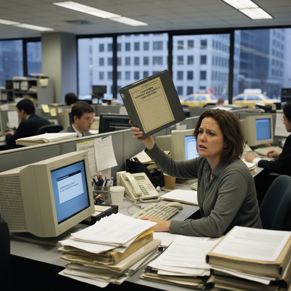 Employee struggling with outdated support information, a productivity killer in modern enterprises.