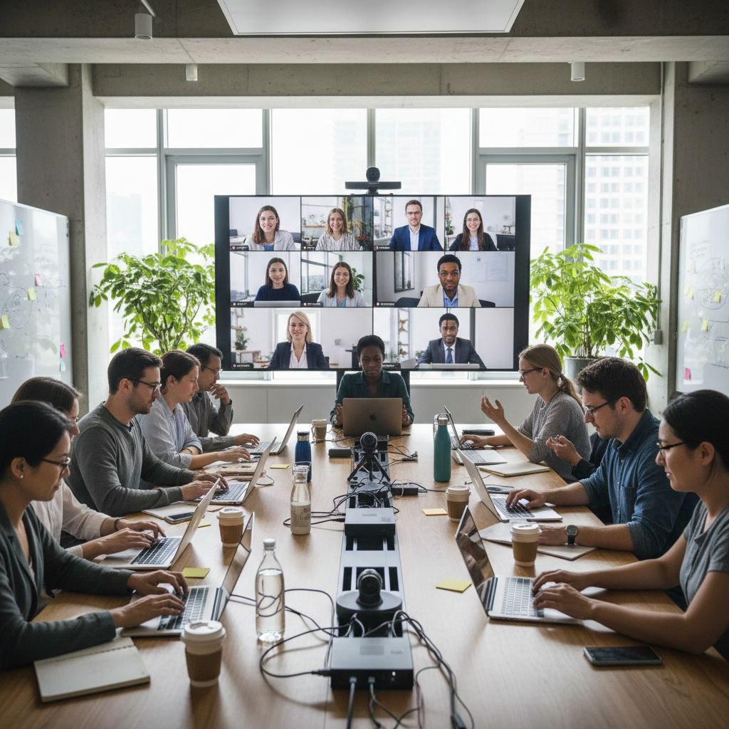 A meeting format that merges in-person and virtual participation, aiming to balance accessibility with authentic connection.