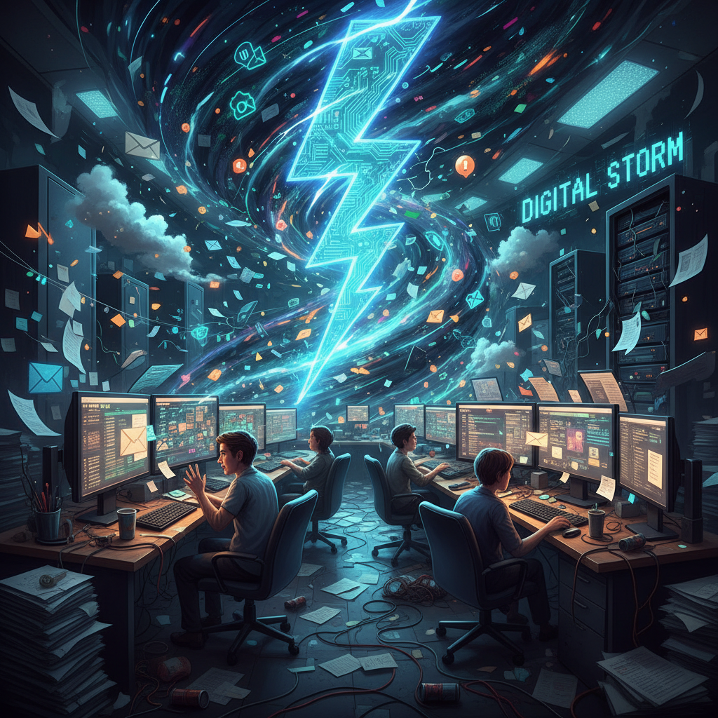 Alt text: Workflow chaos depicted as a storm of digital files and emails in an office setting