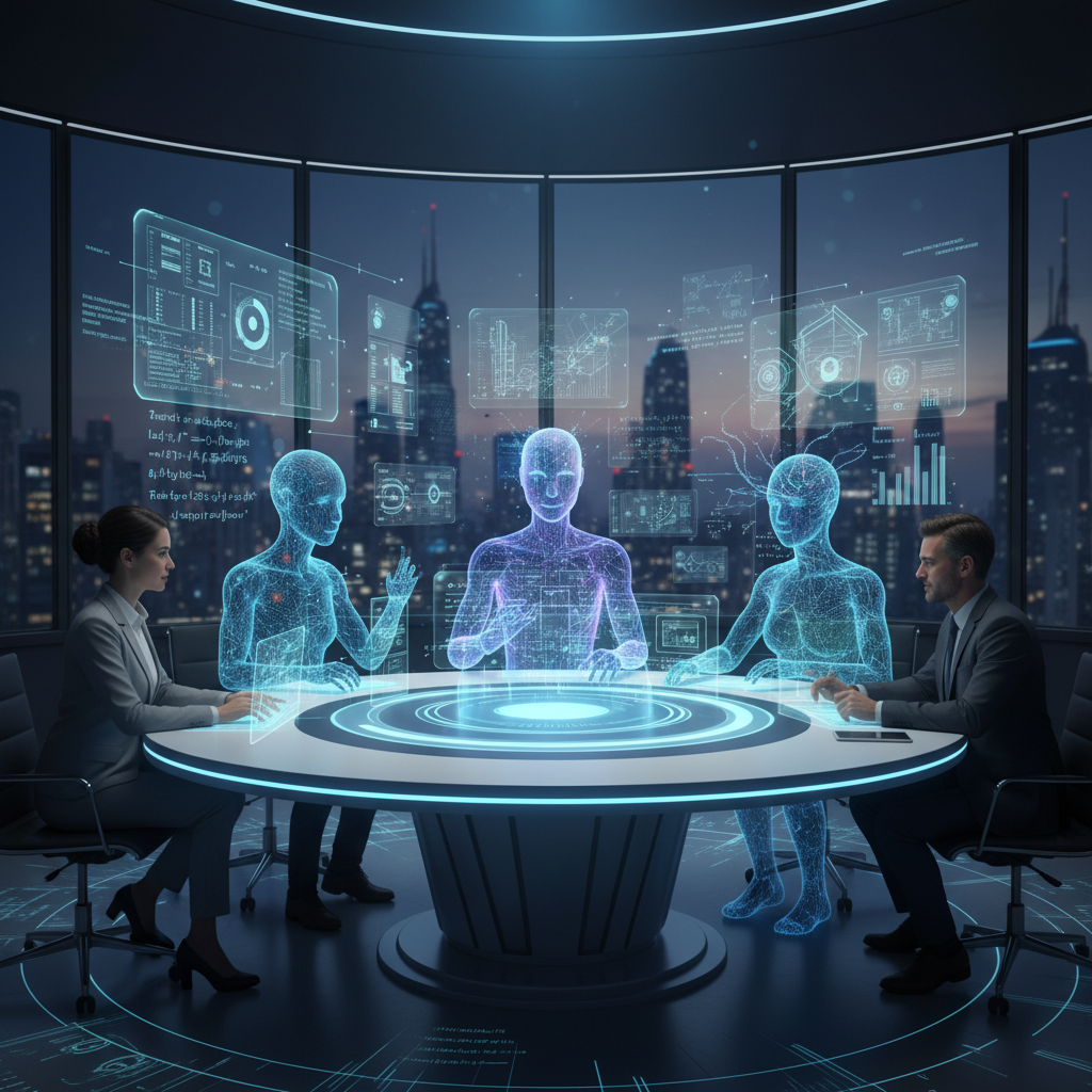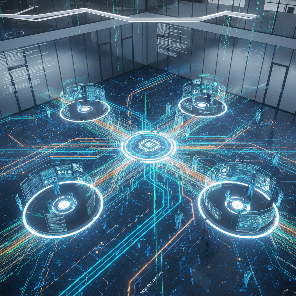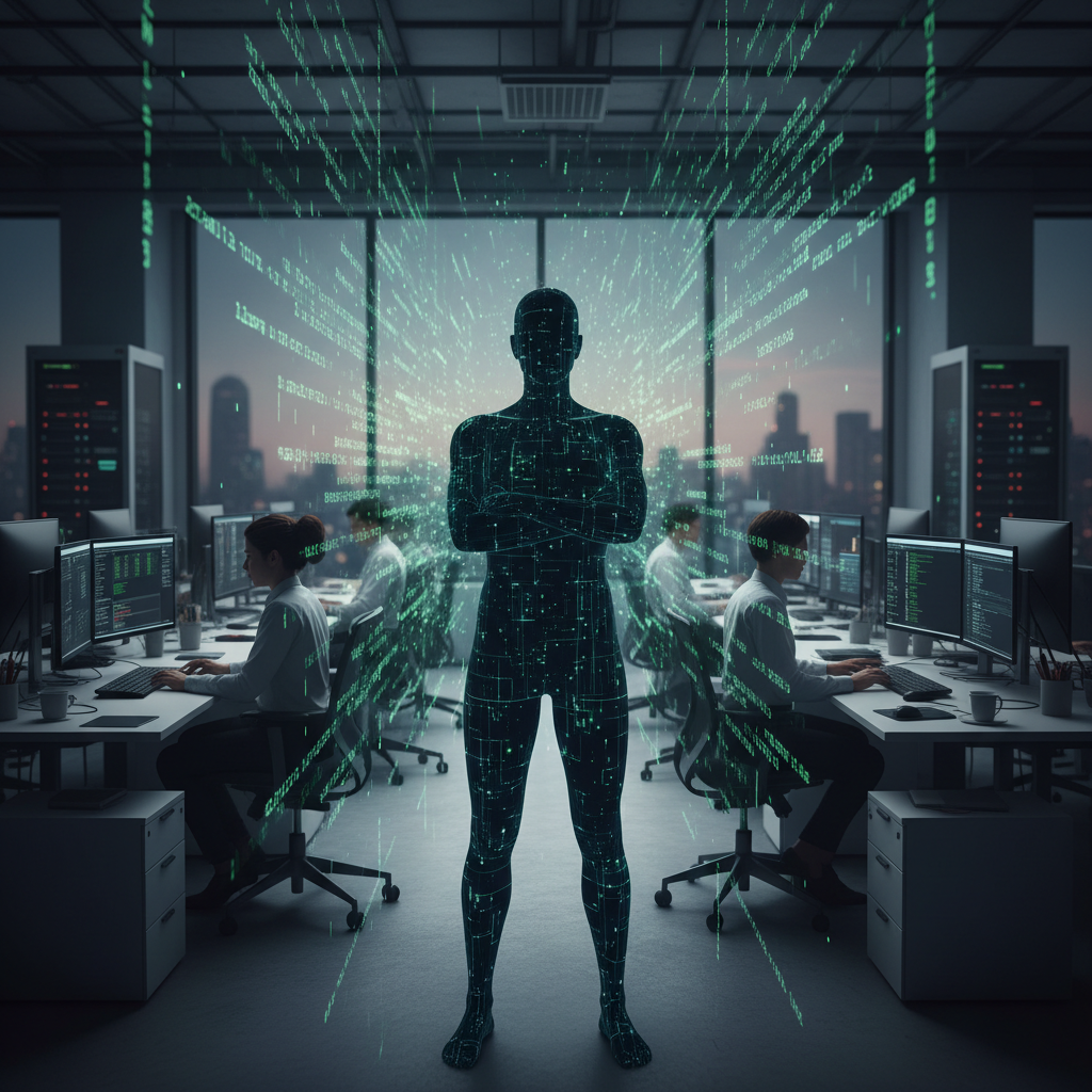 Alt text: Human and AI system coordinator blending in a modern workspace with digital code and office setting