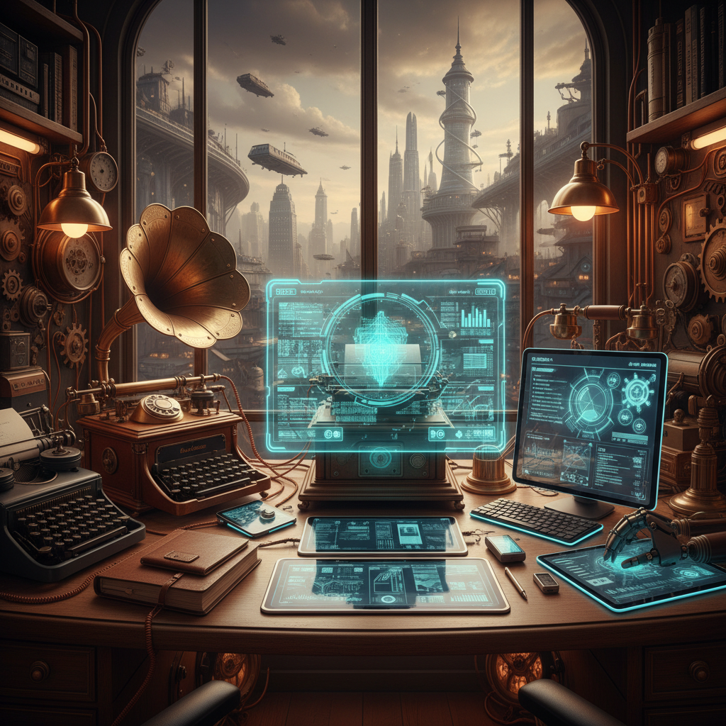 Alt text: Evolution of system coordination tools from old office tools to smart AI devices, retro-futuristic style