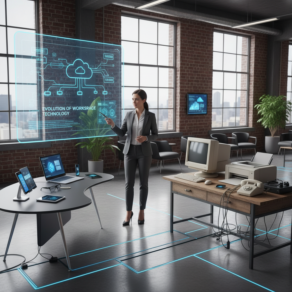 Alt text: Evolution of technology coordinator tools from old to new office tech.