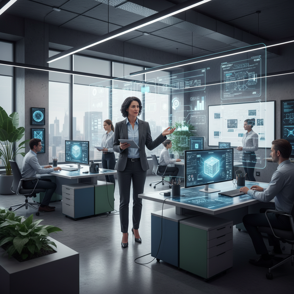 Alt text: Technology coordinator at work in a modern office, surrounded by digital tools.