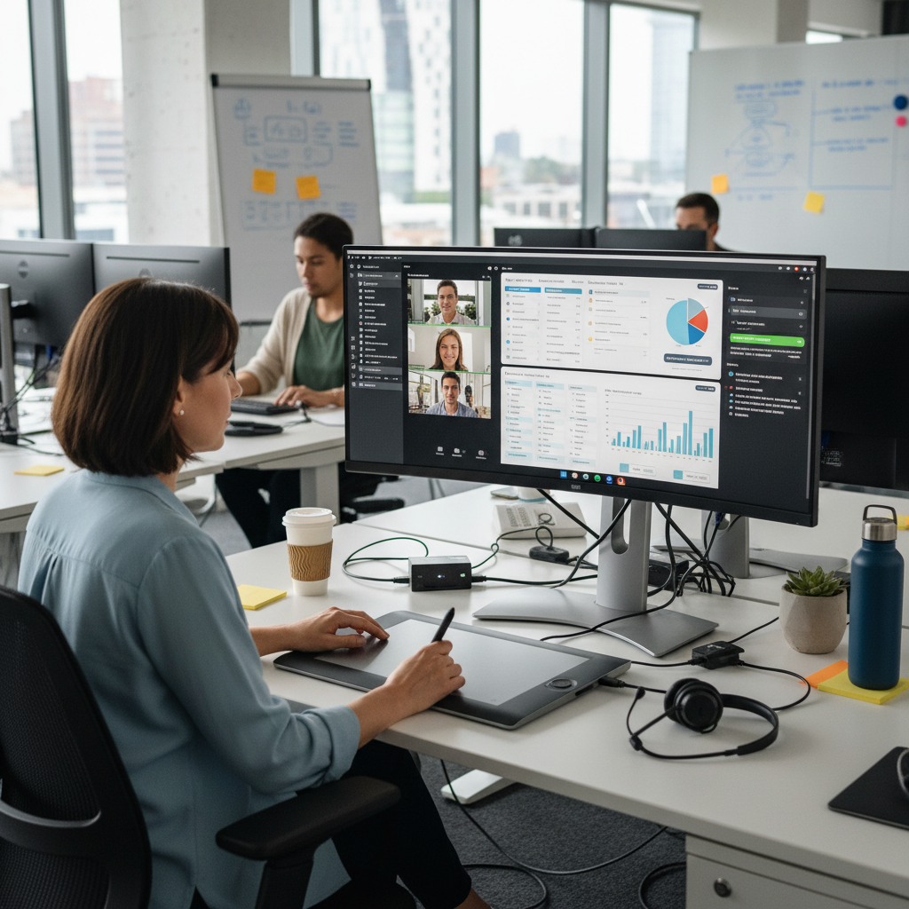 Alt text: Modern tech coordinator's digital toolkit with multiple screens and collaboration apps.