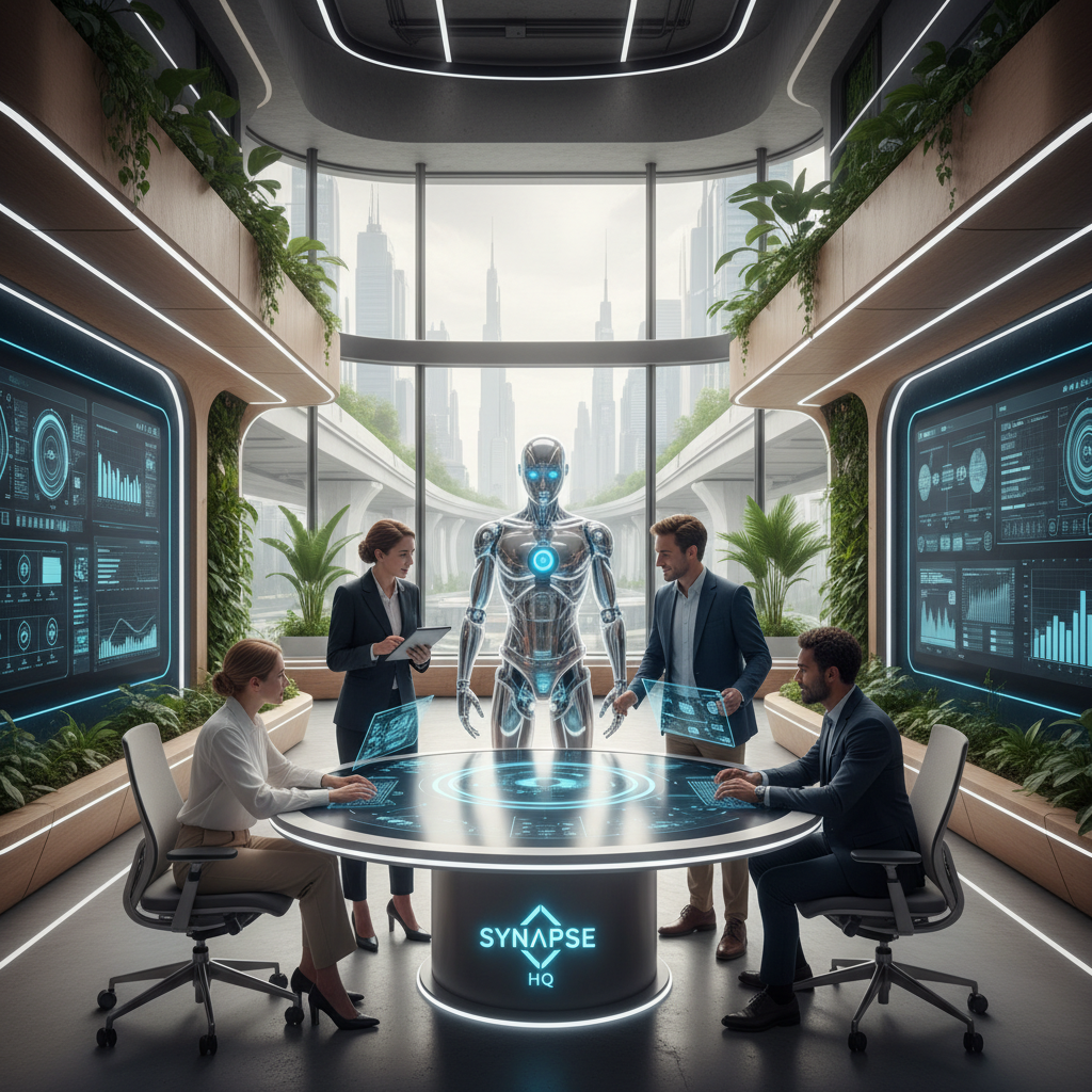 A futuristic office scene showing an AI avatar assisting a diverse team, embodying the new face of technology support.