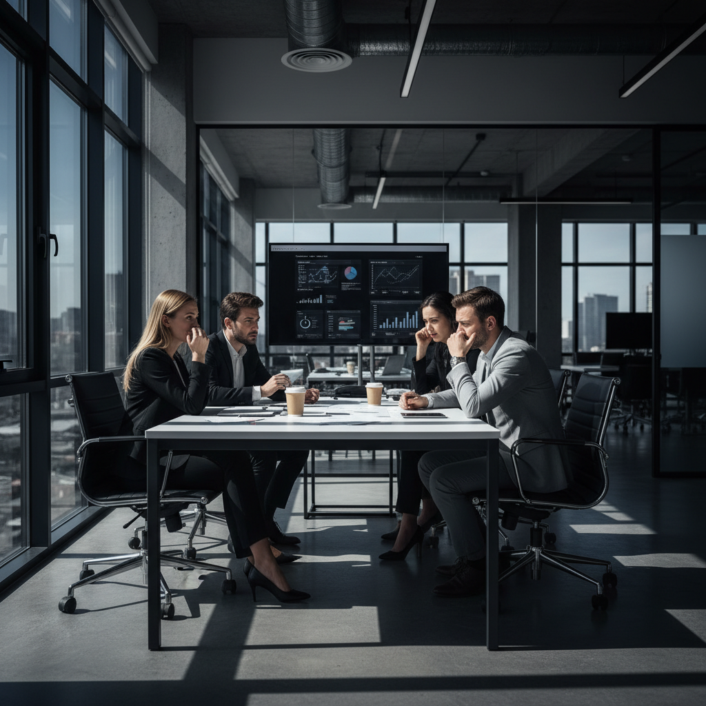 Photojournalistic image: anxious enterprise project team staring at blank screens in a modern office under midday light, symbolizing the consequences of lacking temporary support and the urgent need for rapid, flexible solutions.