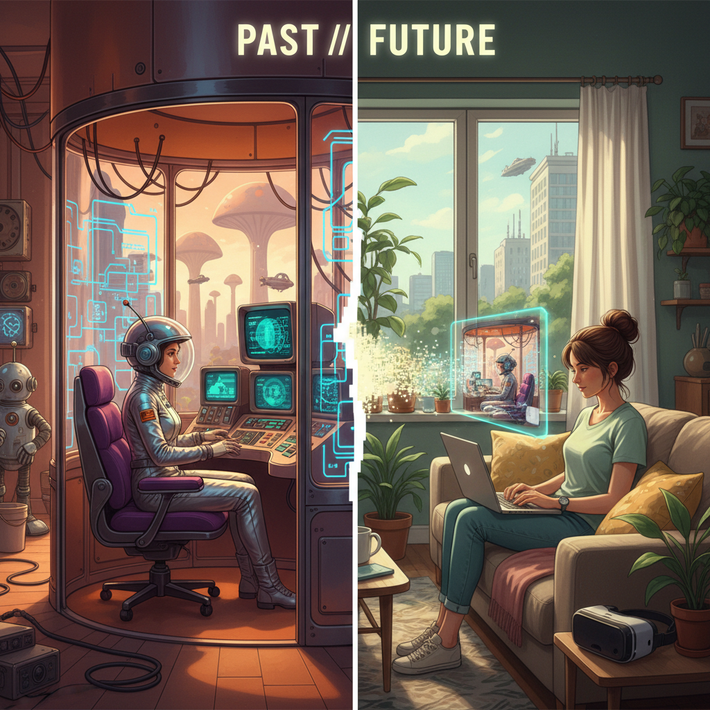 Photo with retro-futuristic split-screen: on one side, old-fashioned cubicle workers; on the other, a remote gig worker at home, visually representing the evolution of temporary support models.
