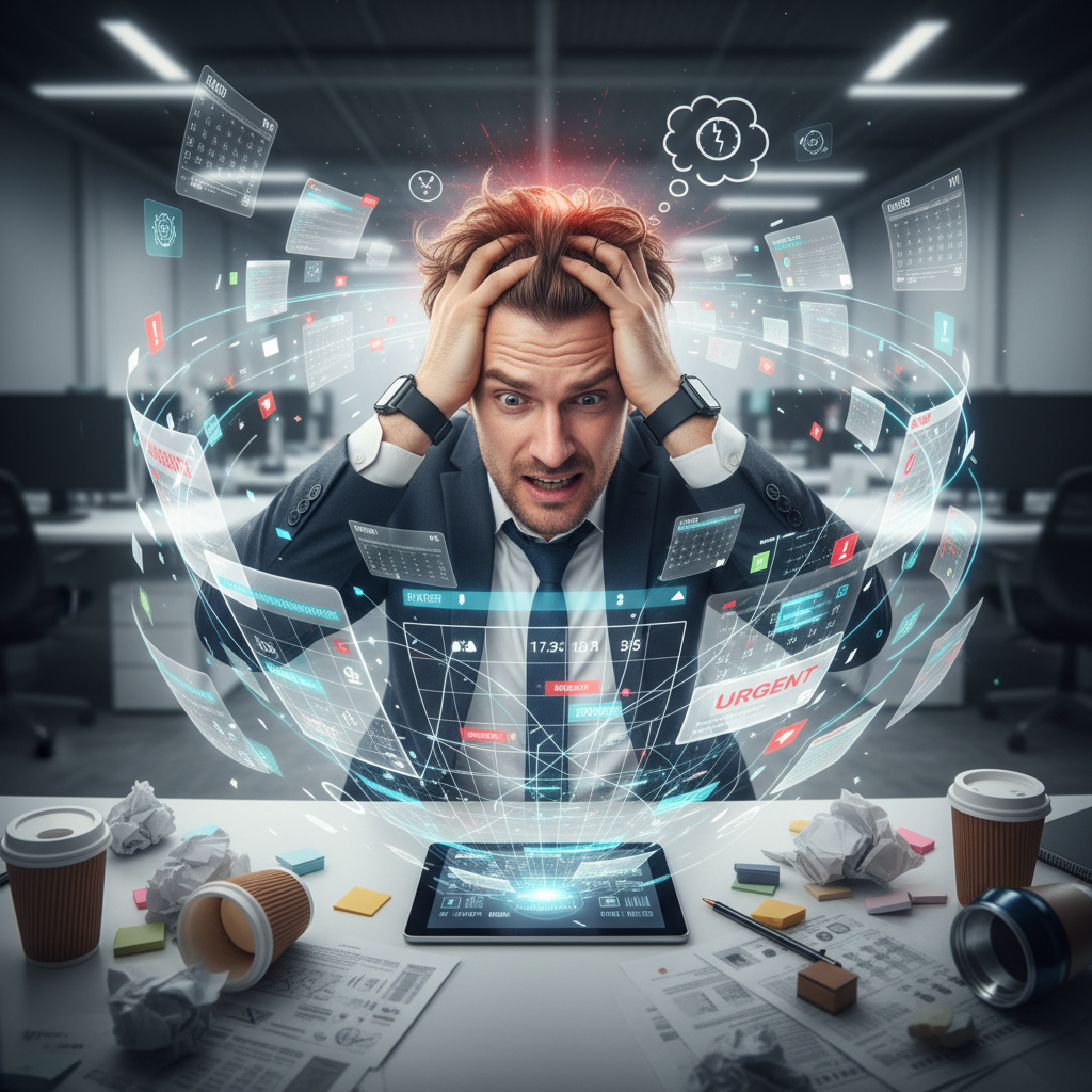 Image: Surreal visual of a worker overwhelmed by floating calendars. Alt: Worker drowning in digital calendar chaos.