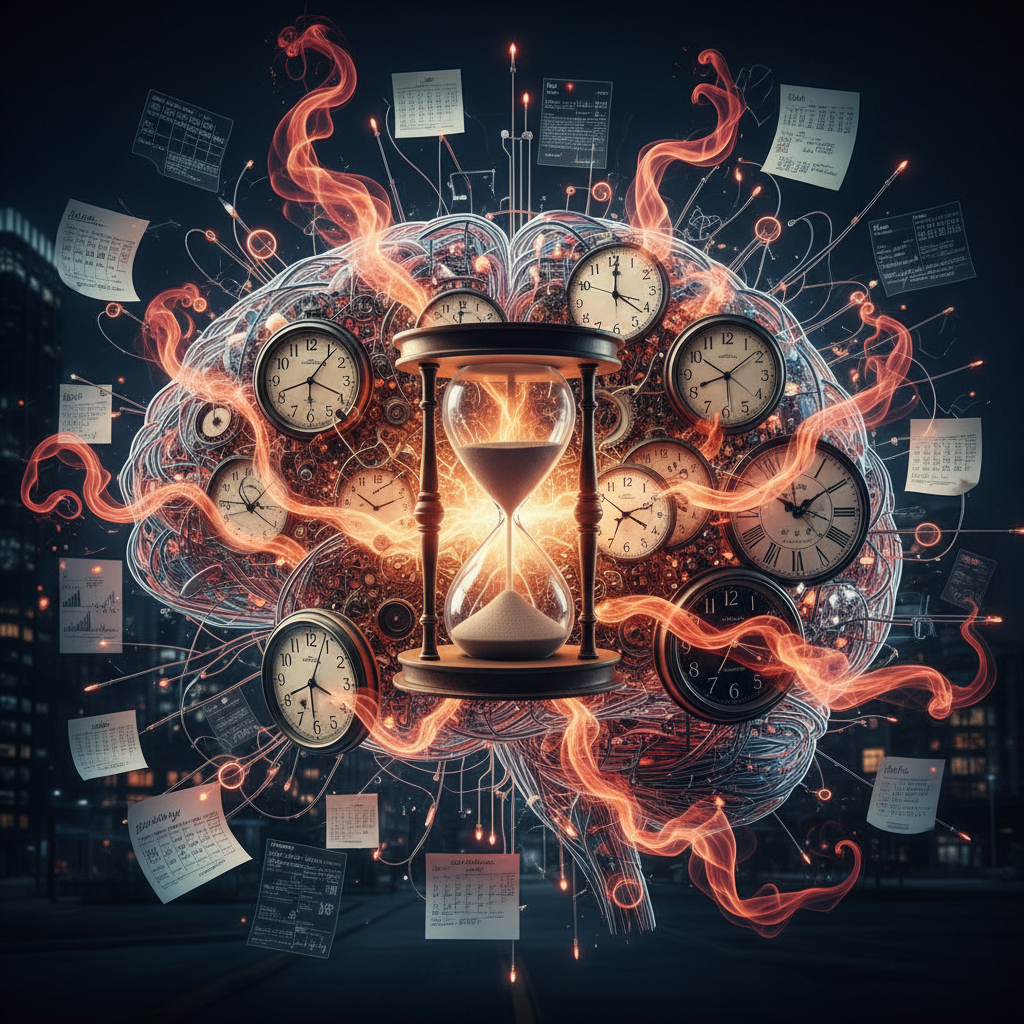 Alt: Abstract photo of a brain tangled in wires and clocks, representing stress and time planning challenges