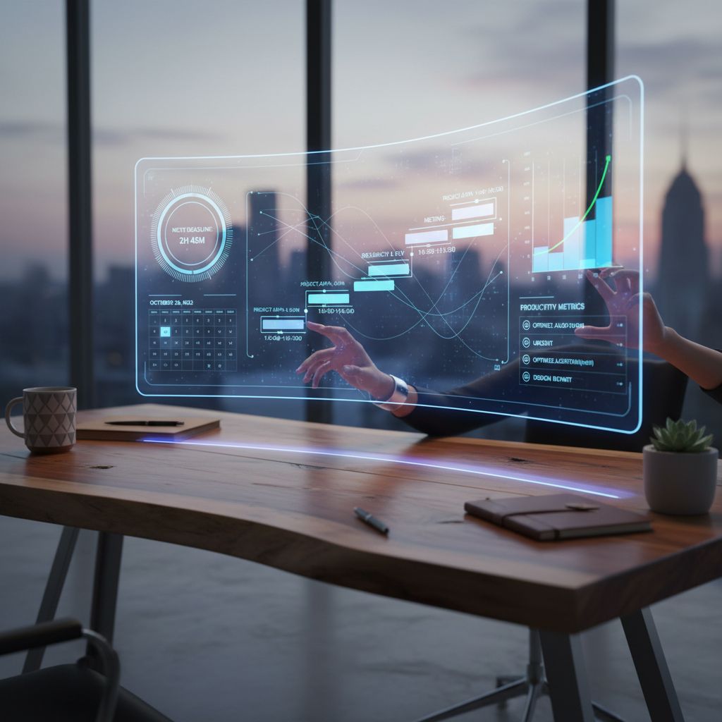 Alt: Futuristic interface overlaying a real desk scene, representing AI time planning dashboard