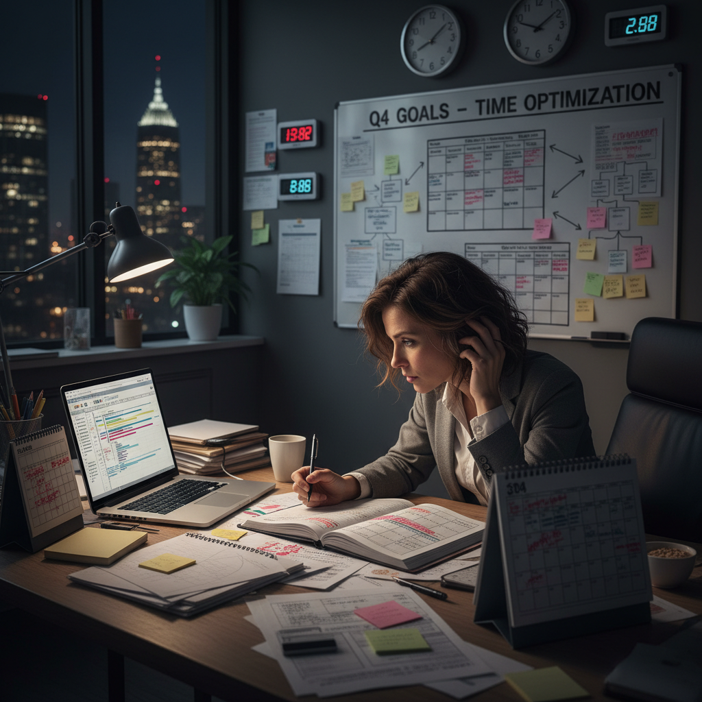 Alt: Tired entrepreneur in a nighttime office, staring at a calendar with visible time blocks, illustrating time planning fatigue
