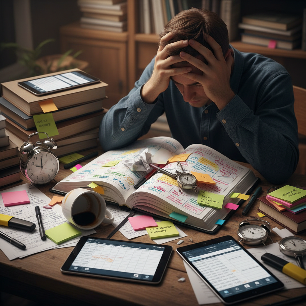 Alt: Overwhelmed hand scribbling in a planner surrounded by sticky notes and time planning tools, symbolizing chaos beneath order