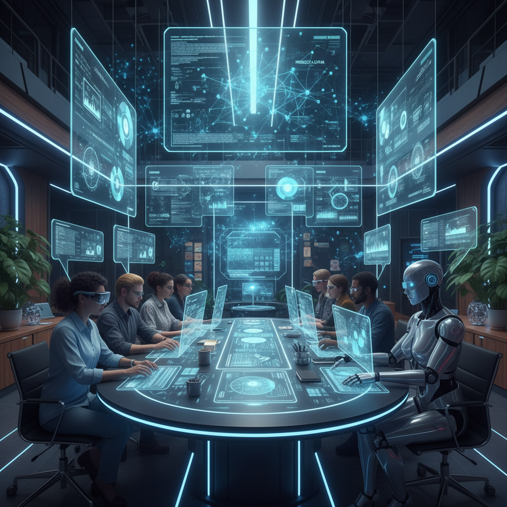 Alt text: Human and AI avatars working together in a virtual office, symbolizing seamless AI-human collaboration.