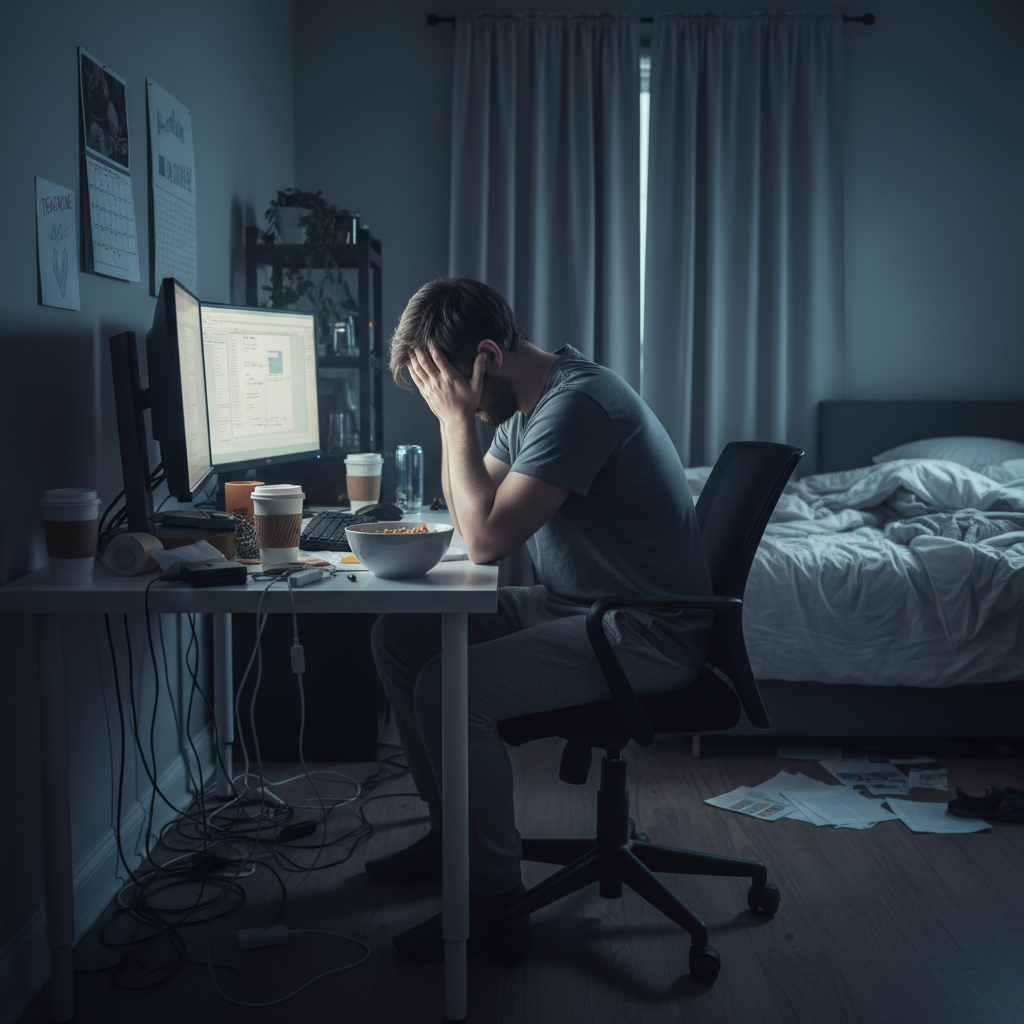 Alt text: Remote worker experiencing burnout at home office, illustrating the potential downside of work from home helpers.