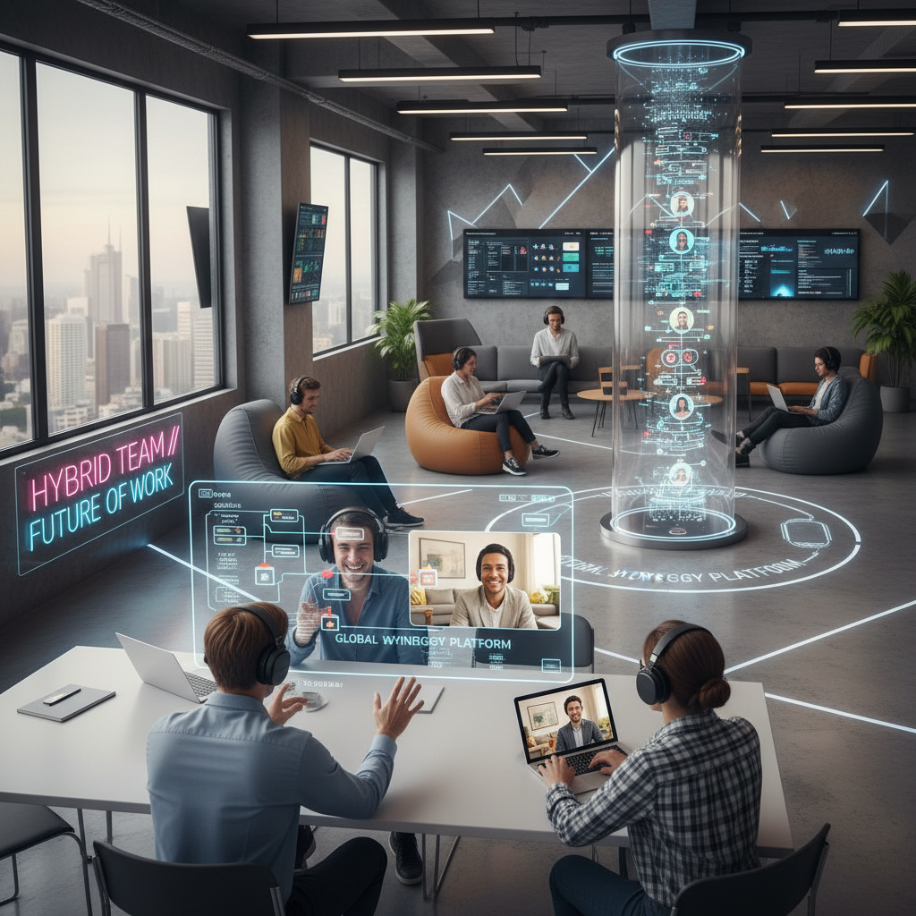 A group combining remote and in-office workers, often supported by digital or AI teammates, whose coordination relies on seamless workflow integration.