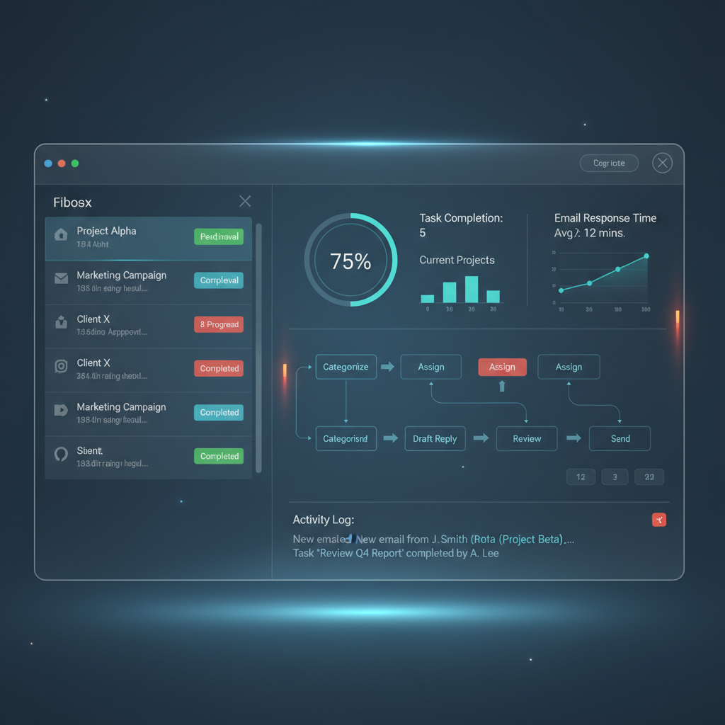 Alt text: Email interface with AI assistant overlay, real-time workflow monitoring and data visualization.