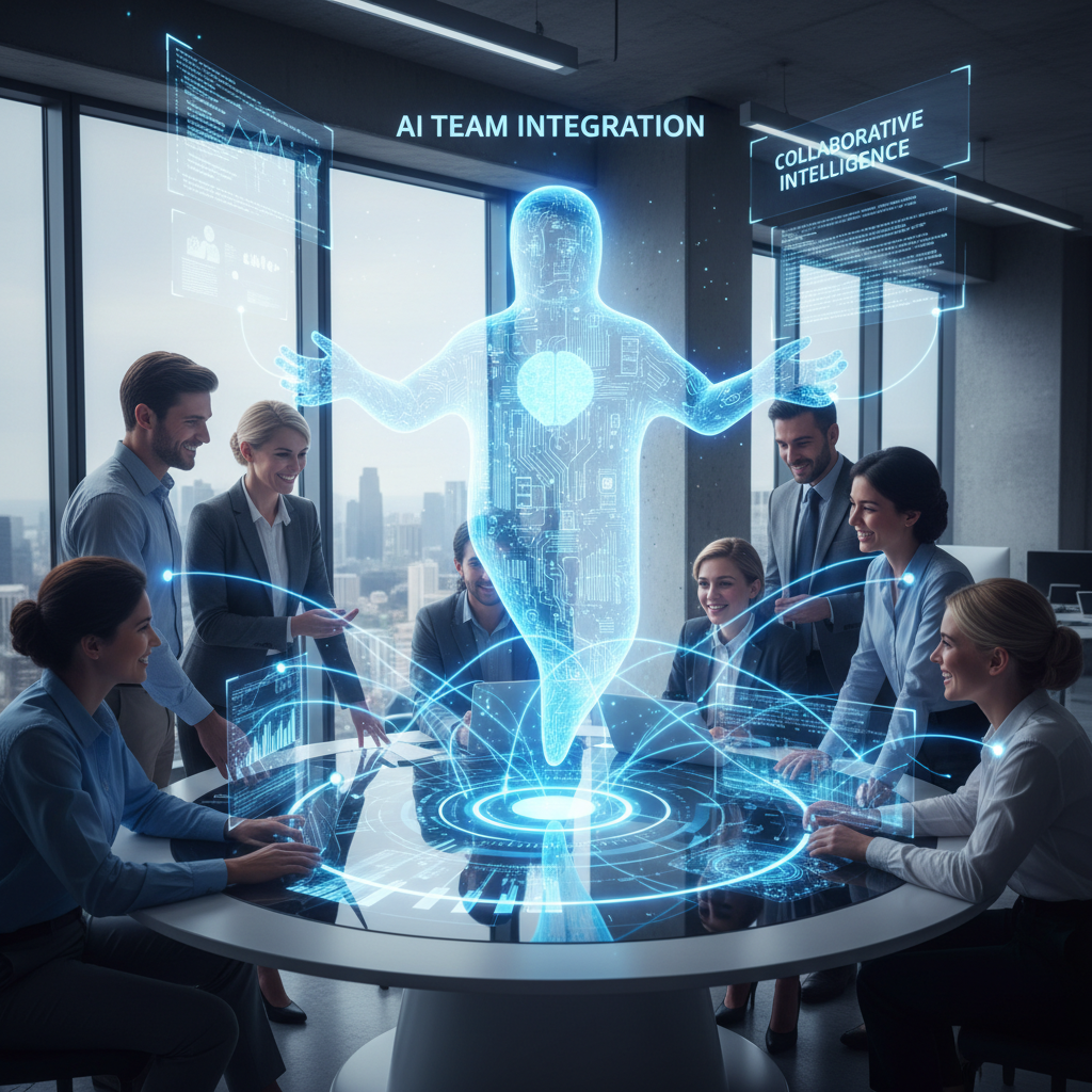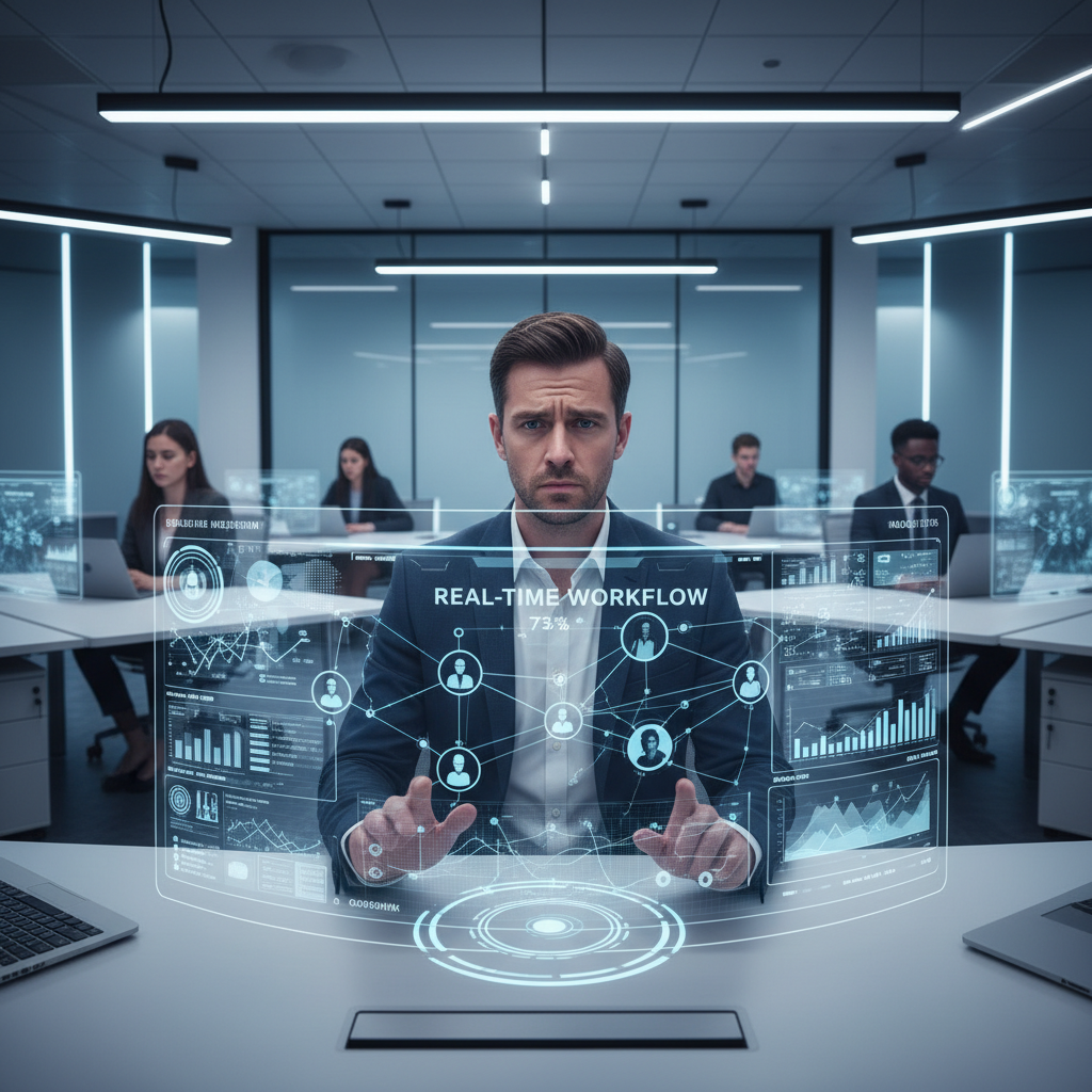 Descriptive alt text: Subtle AI presence guiding workflow in a modern office, workers collaborating, high-contrast lighting.