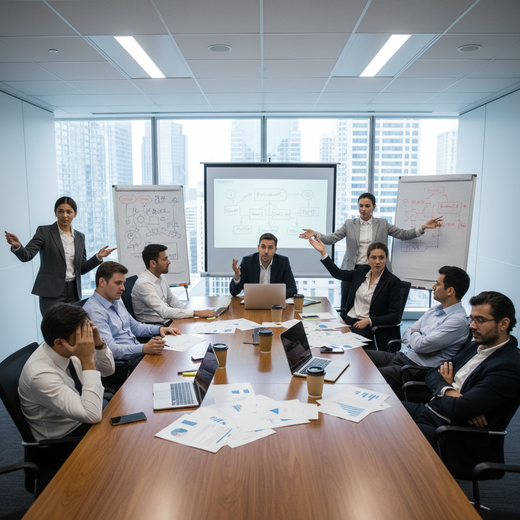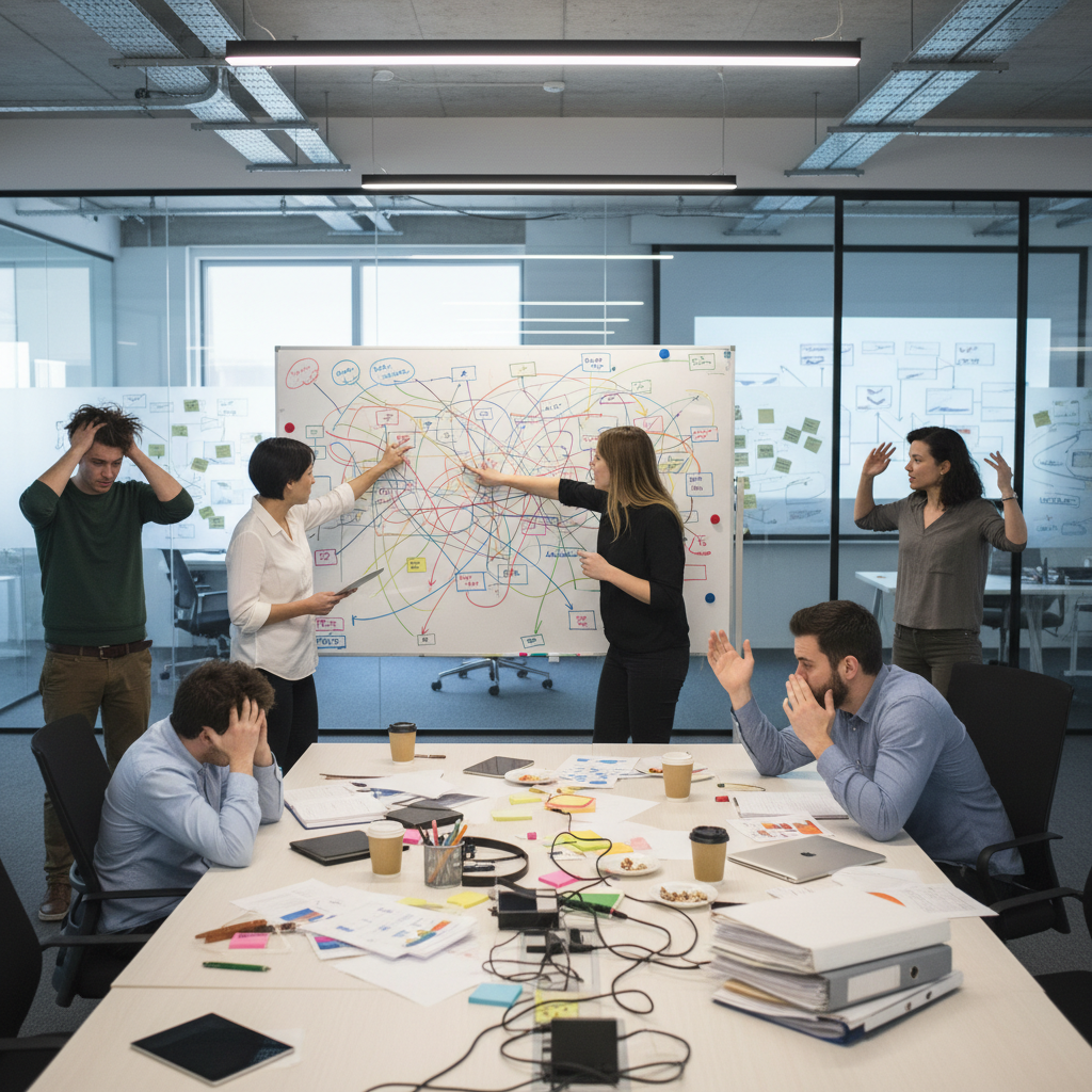Descriptive alt text: A diverse team appears lost and frustrated around a conference table, symbolizing workplace coordination challenges in a hybrid office.