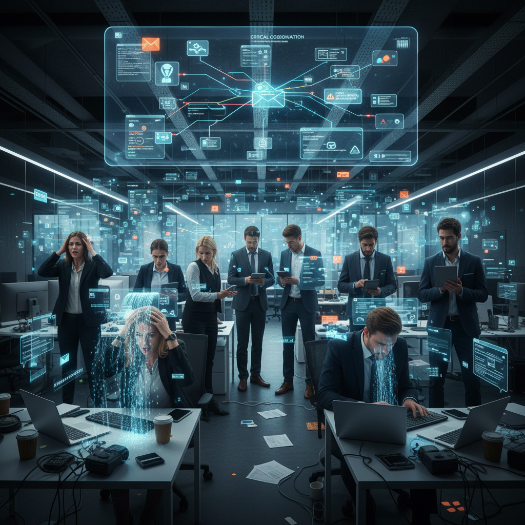 Descriptive alt text: Overlapping digital notifications and anxious workers symbolize the confusion in modern workplace coordination.