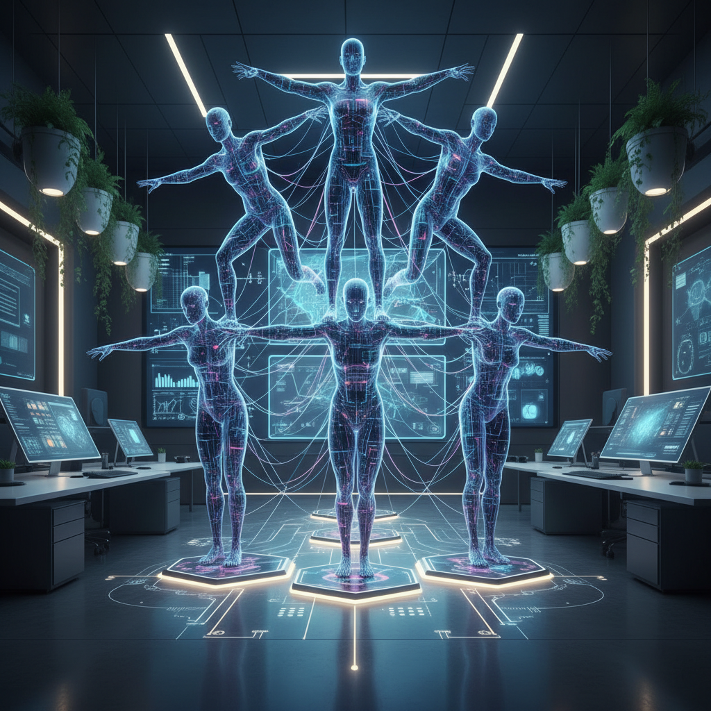 Descriptive alt text: Diverse team collaborating harmoniously, blending digital screens and human connection, symbolizing optimal workplace coordination.